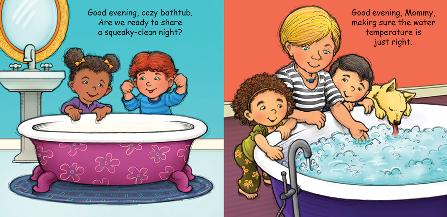 Good Night Bath Time highlights bubble baths, bathtubs, sudsy soap and shampoo, bath toys including rubber duckies and toy boats, fluffy towels, and more. Get ready to splash around in this charming bath book! Children like to recognize their favorite bath-time rituals and may learn some new ones–while being lulled to sleep in traditional bedtime story fashion. Bath time has never been so much fun.