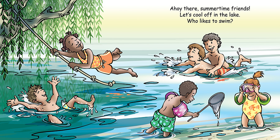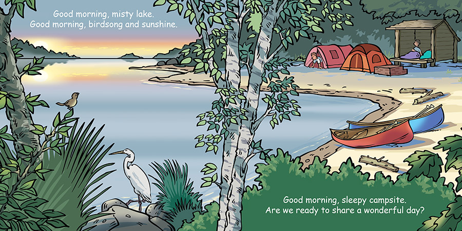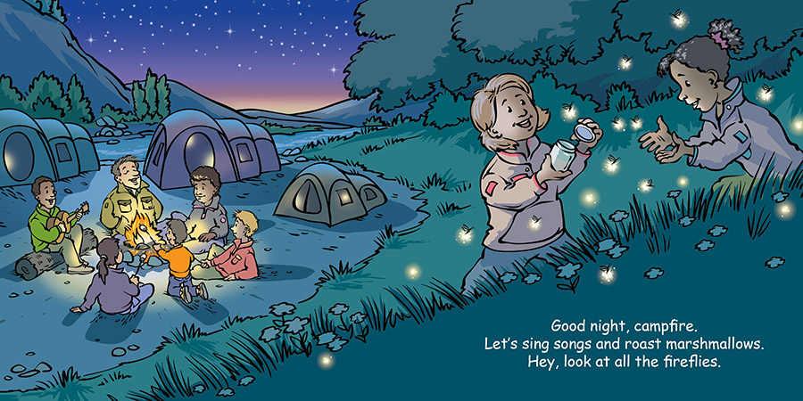 Good Night Campsite features camping, cooking, tents, RVs, lakes, mountains, rivers, trees, ducks, frogs, chipmunks, biking, picnics, hiking, autumn leaves, campfires, fireflies, sleeping bags, and more. Grab your duffel bags, it’s time to head to the campsite. This charming board book takes young readers on an outing to their favorite campsites while indulging in all their favorite outdoor activities. Roasted marshmallows included!