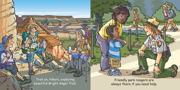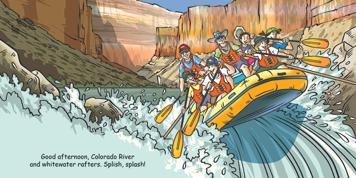 Good Night Grand Canyon features hiking, mule riding, camping, the Colorado River, white-water rafting, fishing, park rangers, Mather Point, Grand Canyon Railway, Bright Angel Trail, Grand Canyon Visitor Center, helicopter tours, off roading, and canyon wildlife. Young discoverers are invited to venture deep into one of the most spectacular canyons in the world. Readers will explore all aspects of canyon life while being lulled into a peaceful nice rest.