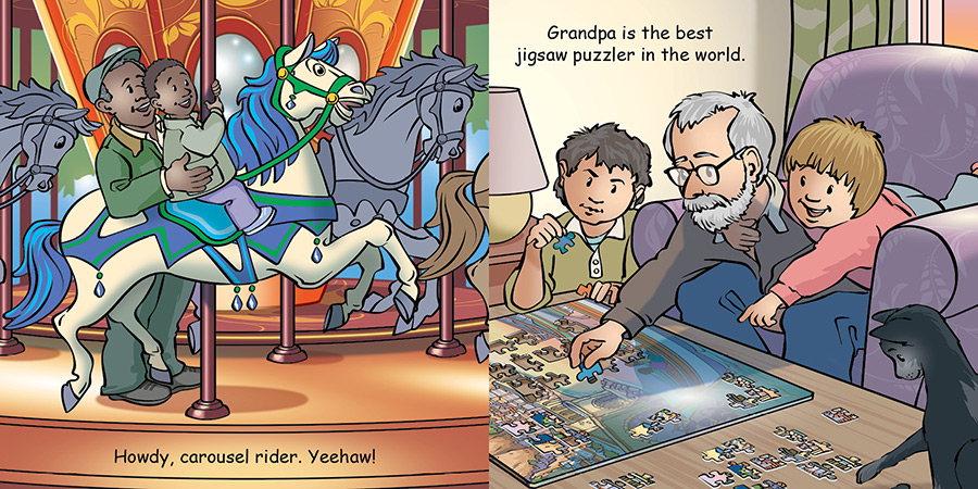 Oh, the joy of spending precious time with Grandpa! Little ones will recognize and celebrate all of the beloved activities they enjoy with Grandpa, including playing cards, doing puzzles, eating cookies, throwing a baseball, having a tea party, drawing, reading a book, fishing, taking the dog for a walk, going for a bike ride, looking at the stars, and more.