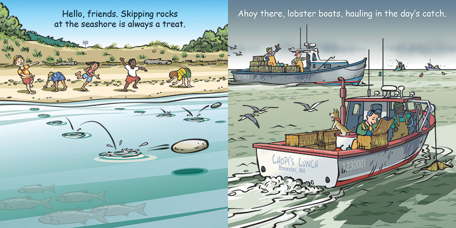 Good Night Seashore features beaches, the ocean, crabs, shorebirds, marshes, dunes, starfish, sea turtles, seaweed, urchins, seashells, clams, lobster boats, plants, jellyfish, minnows, seaglass, fishermen, dune buggies, surfers, swimmers, sand castles, and more. Grab your bathing suit and towel–it’s time to explore the fabulous seashore.